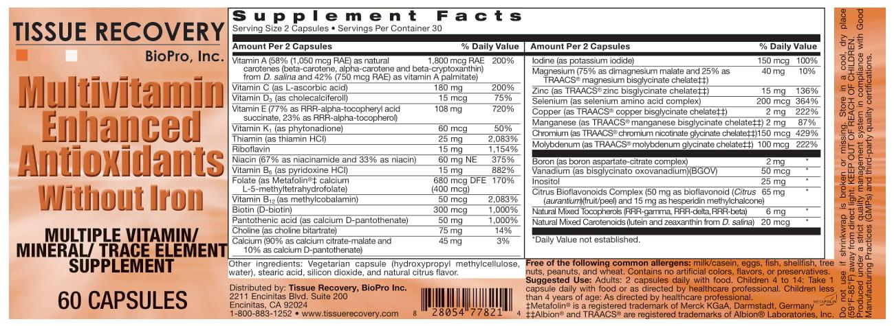 This vitamin and mineral formula feature high-quality ingredients designed for optimal absorption and bio-availability. Rapid disintegration allows quick release of the micro-nutrients. The comprehensive formula of Multivitamin Enhanced Antioxidants without Iron is suitable for adolescents, adults, and seniors.